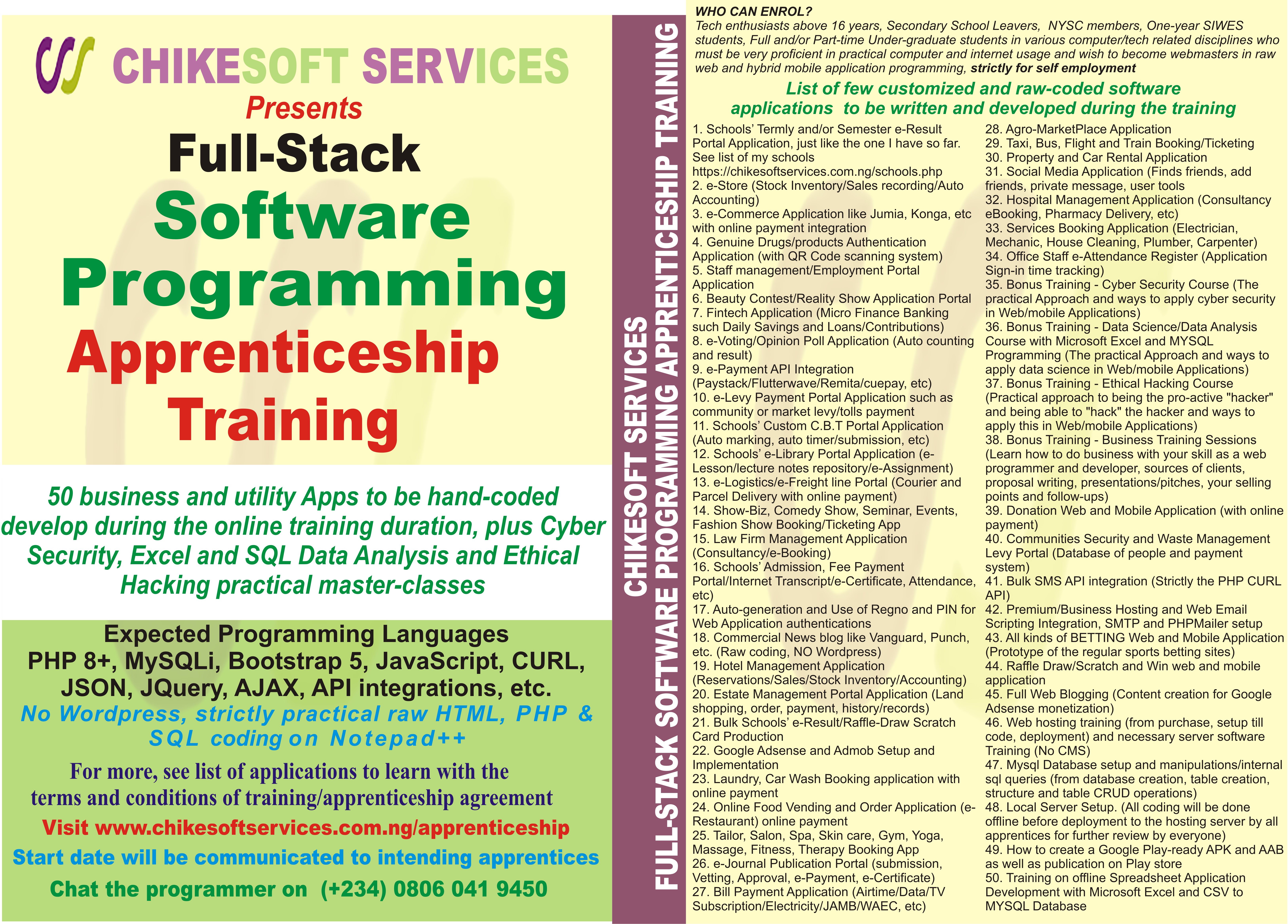(This apprenticeship training is strictly an online training to make you become a Full-Stack (Front and Backend) Web application programming and development in one of the most popular programming languages, PHP 8+, MySQLi/OOP/PDO, Bootstrap, JavaScript for the web, CURL, JSON, JQuery, AJAX, 3rd Party API integrations, etc. (NOT Wordpress or any other kind of other CMS)